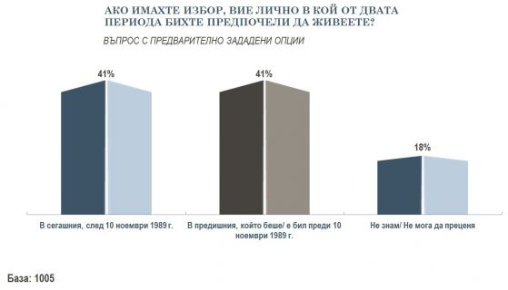 Поставихме респондентите в обстановка да избират в кой интервал биха предпочели да живеят – в настоящия, след 10 ноември 1989 година или в този преди измененията. Обществото е изцяло раздвоено в отговорите на този въпрос, като всяка една от вариантите събира по 41% от отговорите. В разбивката по възраст отчитаме сериозна динамичност. Само под една пета от хората сред 18 и 39 година желаят да живеят в интервала преди 10 ноември, до момента в който над две трети от хората над 60 години биха предпочели социализмът.