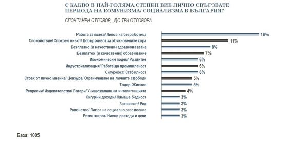 Поради историческата непосредственост с комунистическия интервал, по-висок % от запитаните съумяват да асоциират с съответни неща годините от 1944 година до 1989 година Тук доминират позитивните оценки най-много свързани със обществените достижения на комунизма – работа за всеки (16%), успокоение (11%), гратис опазване на здравето и обучение (8% / 7%). След това идват отрицателните асоциации като цензура и ограничение на персоналните свободи (5%), репресии (4%), изолираност и възбрана за пътешестване (2%).