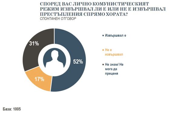 Мнозинството от запитаните (52%) са на мнение, че комунистическият режим е правил закононарушения по отношение на хората, до момента в който единствено 17% не споделят това мнение.
