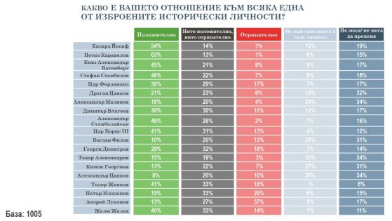 Тествахме и отношението към разнообразни исторически персони. Тук отчитаме няколко зависимости: позитивно отношение към фигурите от комунистическия интервал имат преди всичко по-възрастните хора, до момента в който най-младите имат по-скоро негативно отношение към тях. Не се вижда основна динамичност при другите демографски групи, когато се дефинира отношението към персони от интервала след Освобождението до 1944 година Андрей Луканов и Петър Младенов събират най-вече високи стойности на негативни оценки. Положителното отношение към Желю Желев пък се споделя на практика във всички възрастови групи.