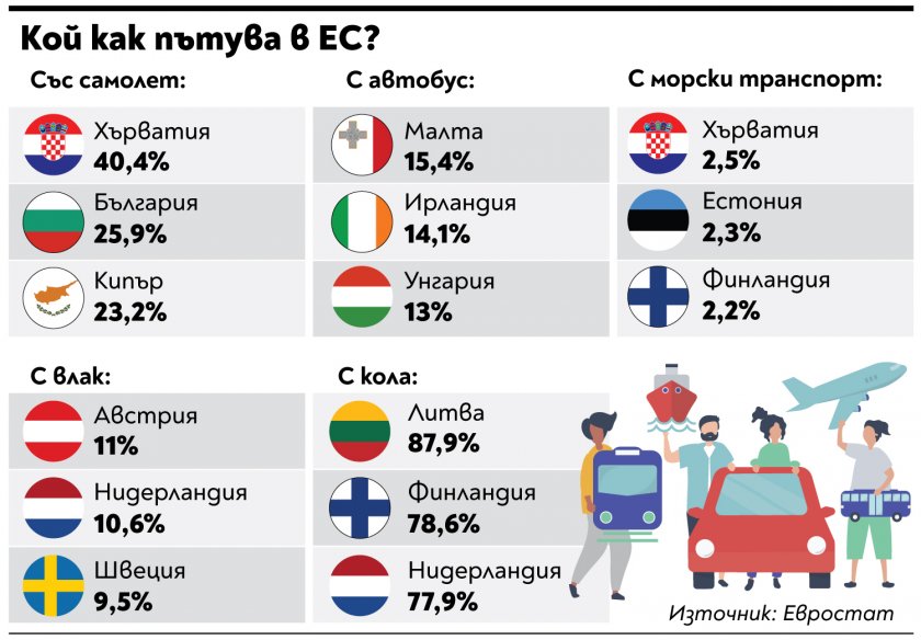 Най-големия дял на напредване с рейс е регистриран в Малта - 15,4%, а с трен - в Австрия (11%).