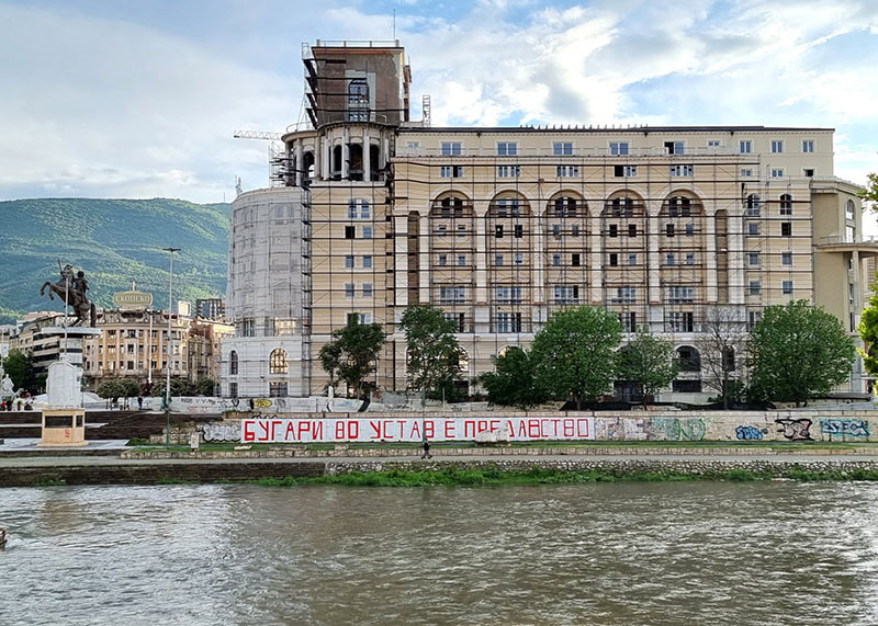 Надпис, който гласи " Българите в конституцията е изменничество ", е изписан на стената на коритото на Вардар в центъра на Скопие. Снимката на надписа илюстрира прессъобщение от партия Левица със същия текст: " Българите в Конституцията е изменничество, на този ден стартира българската фашистка окупация на Македония ", оповестен от няколко уеб страницата в Република Северна Македония, съобщикореспондентът на Българска телеграфна агенция в Скопие.