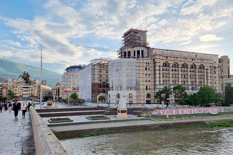 " Българите в конституцията е изменничество ", гласи надпис на стената на коритото на Вардар в центъра на Скопие