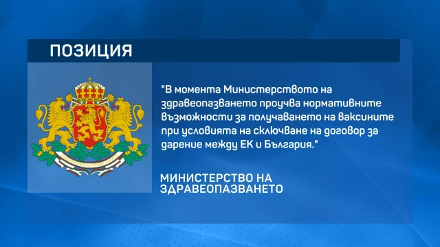 В момента Министерството на здравеопазването изследва нормативните благоприятни условия за приемането на имунизациите при изискванията на подписване на контракт за подаяние сред Европейска комисия и България.