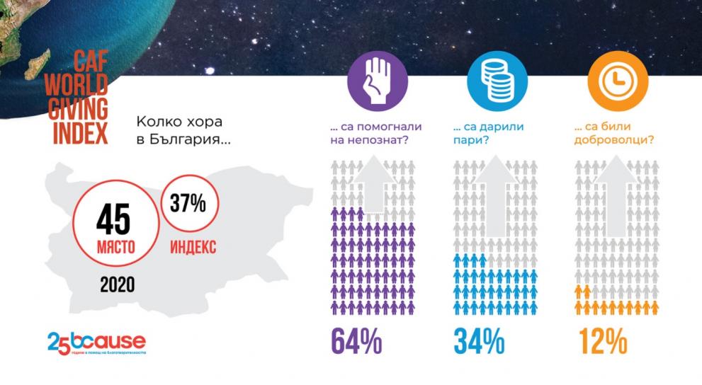 България е на 45-о място по благотворителност в света през 2020, регистрира Световният дарителски показател на КАФ 2020 (CAF World Giving Index 2020) – най-авторитетното изследване, което мери щедростта в 114 страни.