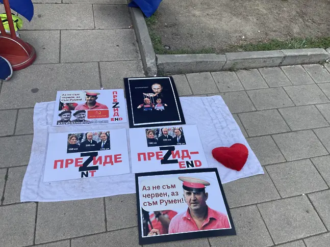 " Фуражка – самальот Масква ", " Аз не съм червен, аз съм Румен ", " ПРЕZИД-END ", гласят протестните плакати. А жителите скандират: " Тук не е Москва! ", " Радев е изменник " и " Оставка ". На митинга има проведена подписка за импийчмънт на президента Румен Радев.
