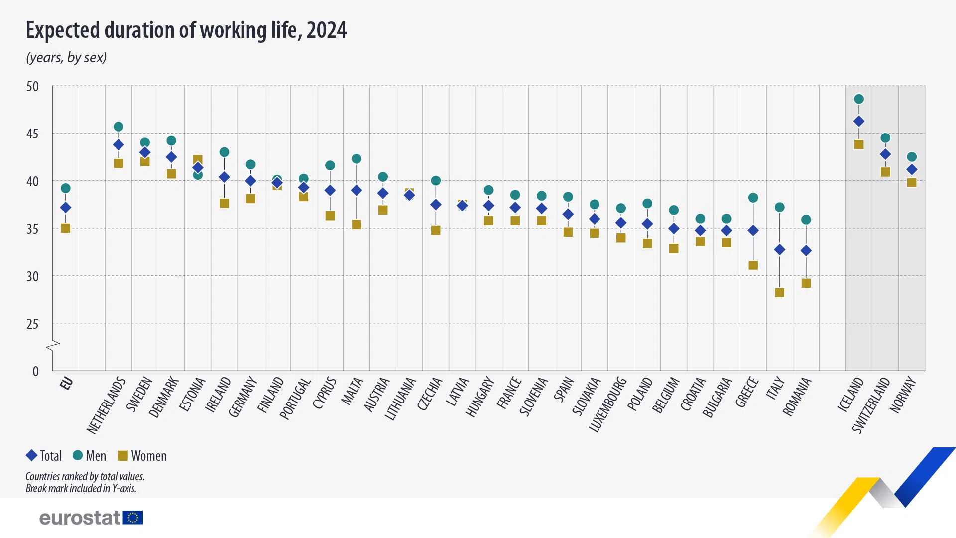 Очакваната дълготрайност на трудовия живот за мъжете в Европейски Съюз е приблизително 39,2 години, а най-кратката дълготрайност се регистрира в Румъния (35,9 години), Хърватия и България (по 36,0 години). На противоположния полюс са Нидерландия (45,7 години), Дания (44,2 години) и Швеция (40,0 години).