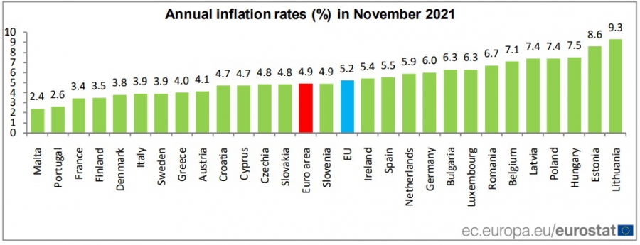 Средната годишна инфлация за страните от еврозоната възлиза на рекордните 4.9% през ноември (4.1% през октомври), до момента в който инфлацията за целия Европейски Съюз нараства до 5.2% (4.4% през октомври).