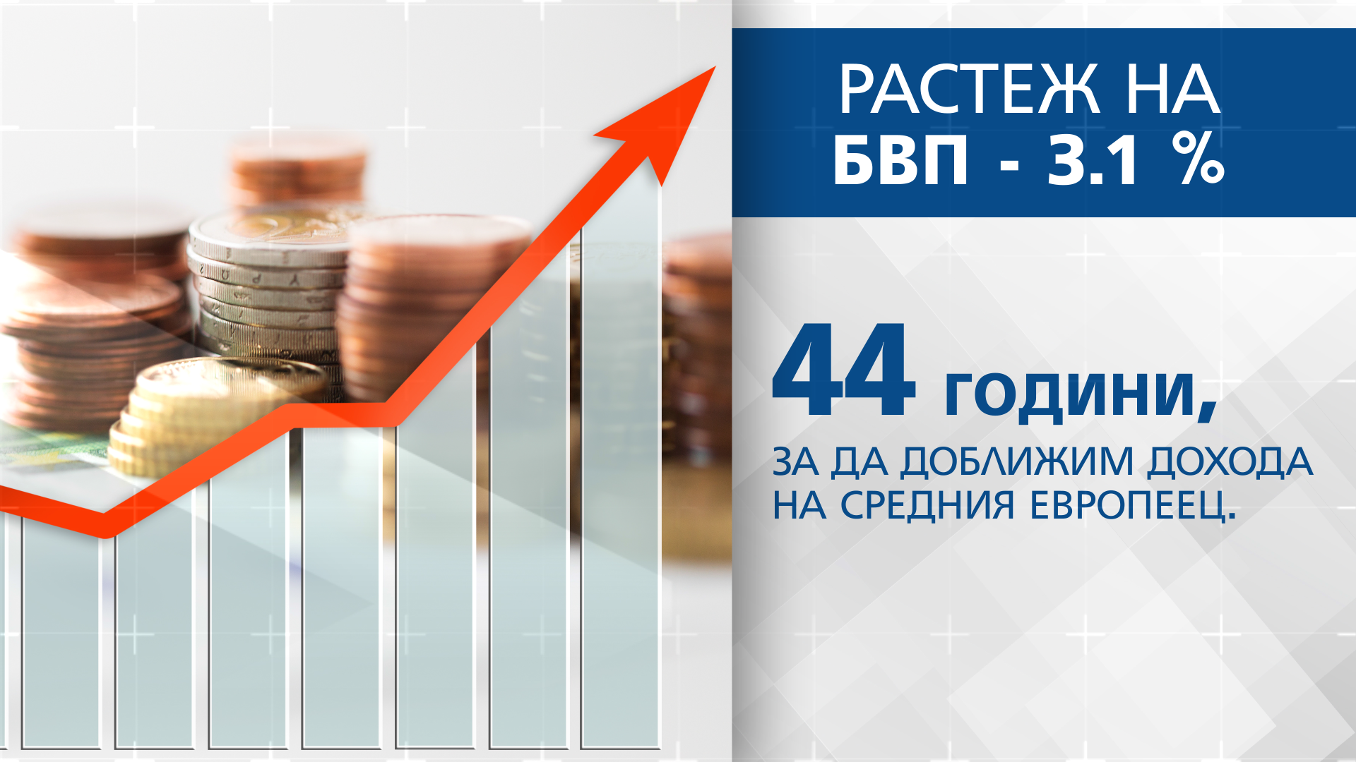 Темпът на стопански напредък на Брутният вътрешен продукт е 3.1 % през 2018 година, което подрежда България в междинните позиции на Европейски Съюз. Затова специалистите пресмятат – с този ритъм ще ни трябват 44 години, с цел да се доближим до прихода на междинния европеец.