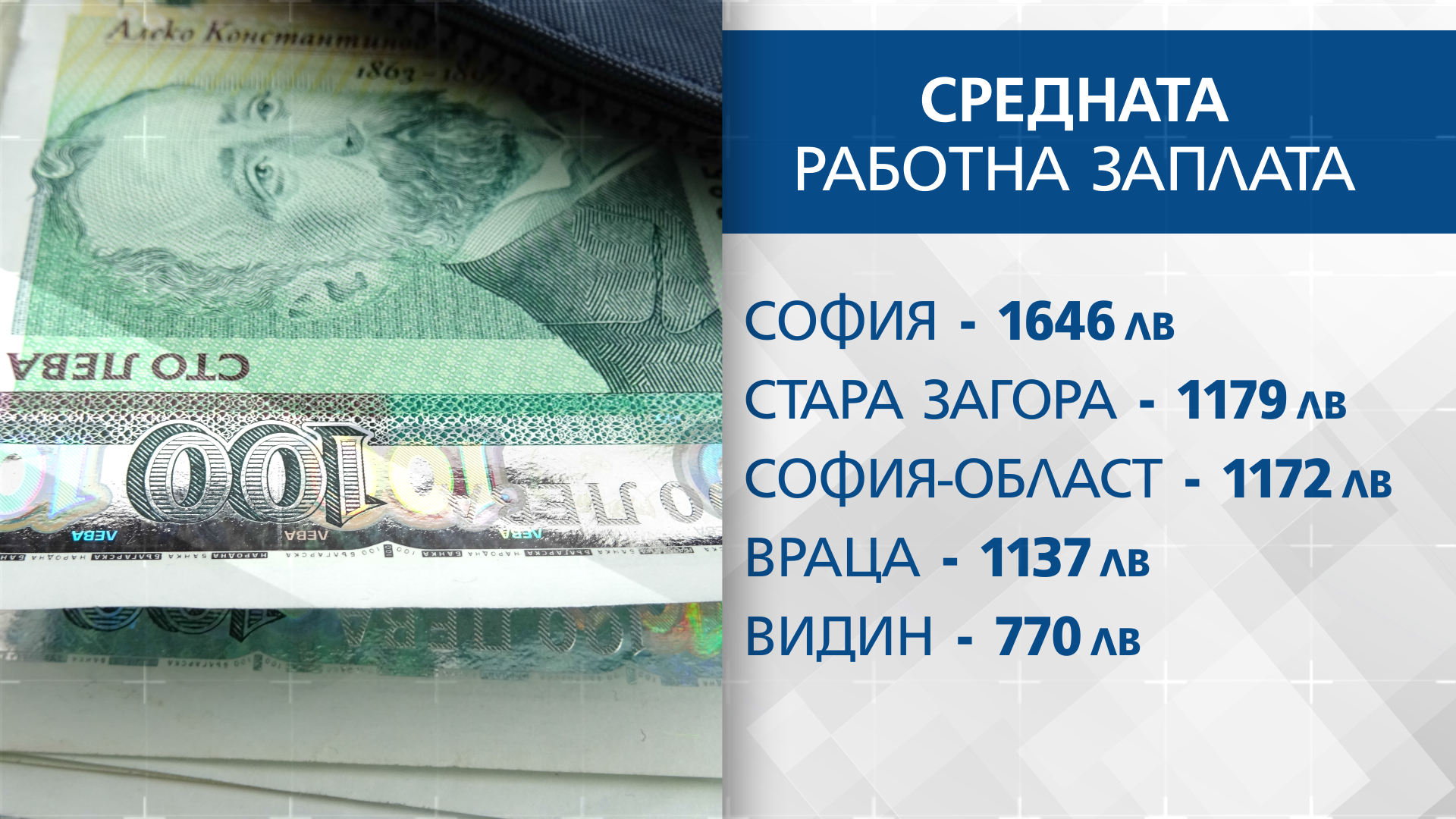Данните на Национален статистически институт сочат в София междинната работна заплата е с 65% по-висока от тази в страната 1646 лева Само в осем области заплатите са над 1000 лева Стара Загора, София-област и Враца оглавяват класацията, а най-ниски заплати получават във Видин – приблизително 770.