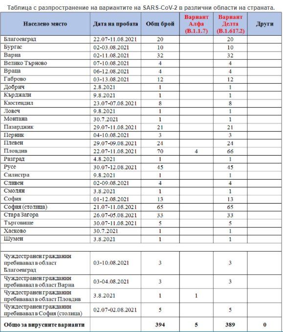 Центърът регистрира и 389 нови случая на инфектирани с Делта разновидността на SARS-CoV-2 от оценени 394 клинични проби.