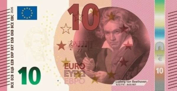 Лудвиг ван Бетовен (10 евро), водещ немски композитор на класическа музика, с неговите 9 симфонии - несравними творби. Европейският химн „ Ода на насладата “ е откъс от неговата Девета симфония, композирана през 1823 година