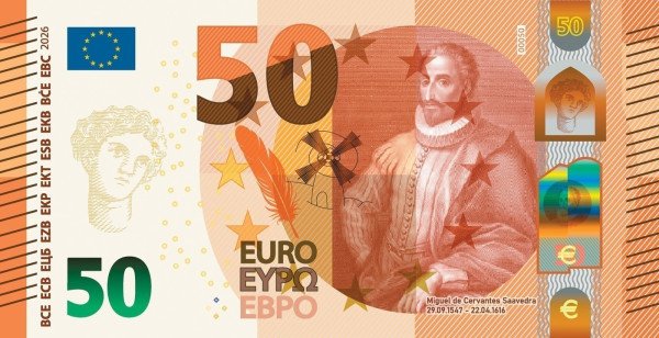 Мигел де Сервантес (50 евро), водещ испански романист и създател.