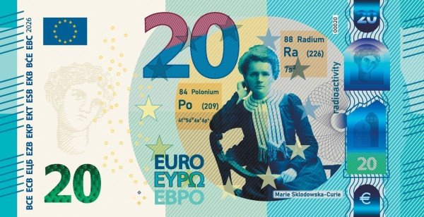 Физикът и химик Мария Кюри (20 евро), която дружно със брачна половинка си при започване на предишния век открива радий, полоний и разкрива тайните на природата на радиоактивността.