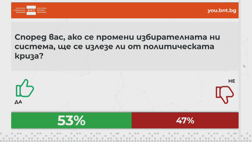 " Промяната на изборната система няма да реши дълбоките учредения за политическата рецесия, тъй като по какъв начин формираме политическото посланичество е механически инструмент. Същевременно в България имаме дълбоки политически проблеми. Промяната в изборната система, изкуственото обезпечаване на болшинство на една политическа мощ ще постави капак върху дълбоките проблеми, които ще продължат да стоят и те ще избуят - било то посредством митинги на улиците, било то по различен метод. Разломите могат да станат толкоз огромни, че да изместят България от нейната евроатлантическа орбита. Така че, лесни решения на актуалната обстановка няма. Не би трябвало да се заблуждаваме или да отместваме погледа на хората. Ние би трябвало да проведем диалога за аргументите за дълбоките разломи в обществото ", акцентира Йорданова.