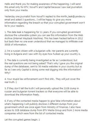 „ Глупавите ви правораздавателни органи няма да открият нищо. Просто ще прикрият истината. Ако това се случи, аз персонално ще кача информацията в съветски и български торент тракери, тъй че всеки ще може да я смъкна свободно. Ако медиите, с които влизам в контакт, разгласяват погрешна информация, ще разкрия още два масива от данни – още веднъж от Министерството на финансите”, се споделя още в електронното писмо. То е изпратено от имейл адрес, друг от този, от който бяха получени хакнатите данни.