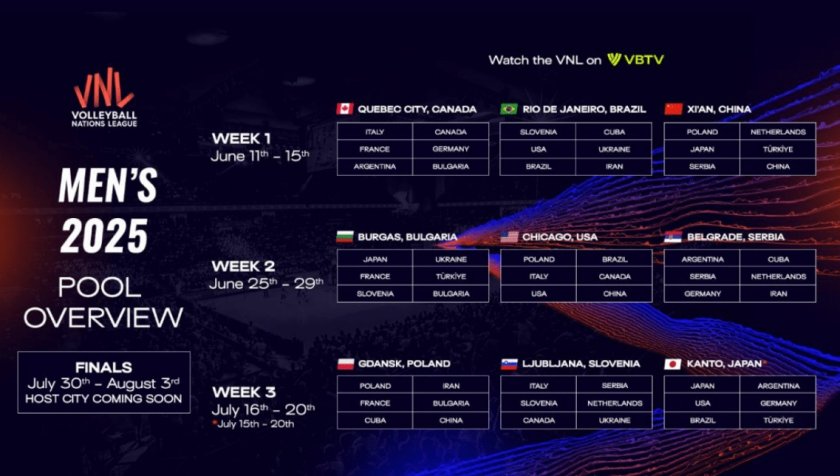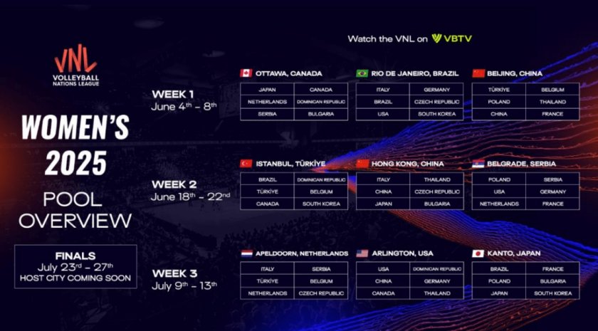 България публично бе оповестена като един от домакините на Волейболната лига на нациите (VNL) през 2025 година. Днес Международната федерация по волейбол (FIVB) разгласява програмата по дати, градове и страни, както и предварителната разбивка на тимовете. Точната стратегия за мачовете ще стане ясна в допълнение, като съгласно регламента всеки тим играе по четири мача във всяка обособена седмица.