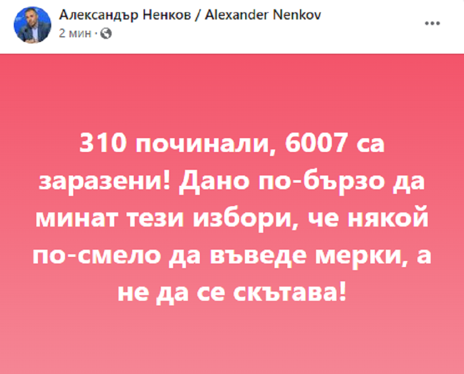 “Дано по-бързо да минат тези избори, че някой по-смело да вкара ограничения, а не да се скатава! “, написа Ненков във Facebook.