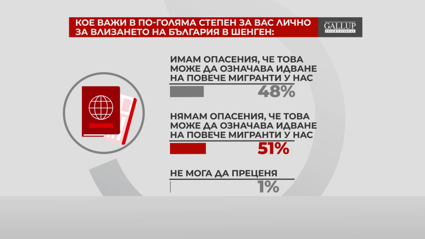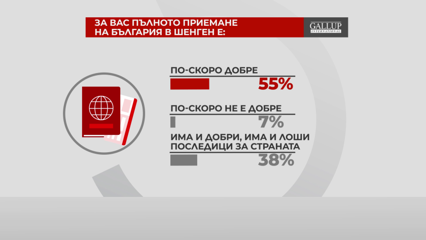 Мнодинството от интервюираните - 55% счита, че пълноправното приемане в Шенген е положително за страната ни против единствено 7%, които са скептични. 38% показват, че се чакат и положителни, и неприятни последствия.