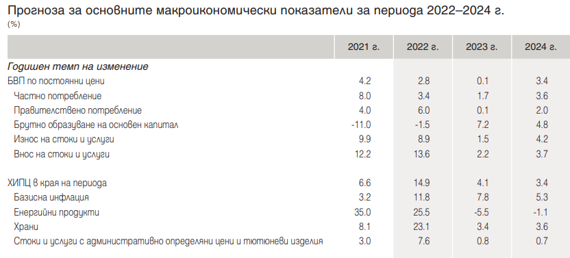 За по-ниския напредък на икономическата интензивност през 2022 година ще способстват намаляването на чистия експорт и забавянето на растежа на частното ползване поради инфлацията. Тази динамичност ще бъде единствено отчасти обезщетена от упования по-силен напредък на държавното ползване, както и от значителното струпване на ресурси в стопанската система отново поради инфлацията и несигурността в световните вериги за доставки.