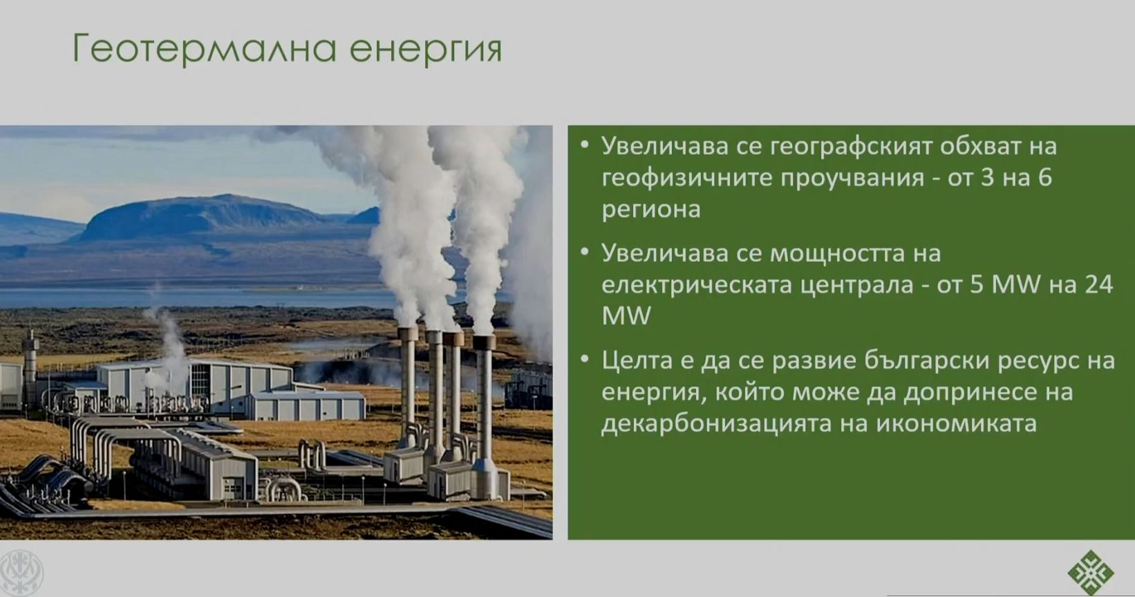 От думите на вицепремиера стана ясно, че България се готви с изключение на да удвои регионите за изследвания и да построи две централи, работещи въз основа на геотермалната сила. Едната - топлинна, другата - електрическа.
