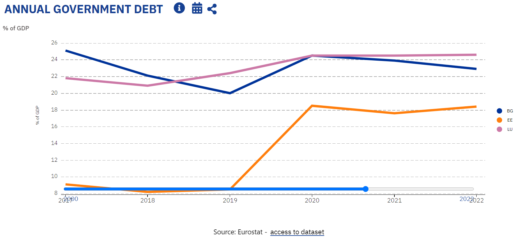 България резервира второто си място в Европейски Съюз измежду страните с най-нисък дълг, съгласно последните публични данни от Евростат от м. юли 2023 година Към края на първото тримесечие на 2023 година съотношението на дълга на бранш „ Държавно ръководство “ към Брутният вътрешен продукт възлиза на 22,5%, като единствено Естония има по-нисък дълг. Всички други 25 държави-членки имат по-високи равнища на дълг, при приблизително за Европейски Съюз - 83,7%. Това оповестиха от Министерството на финансите (МФ)