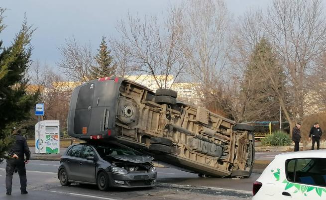 Таксито блъснало задната дясна гума на буса, който като във кино каскада, се обърнал във въздуха и паднал върху движещия се в прилежаща лента лек автомобил.