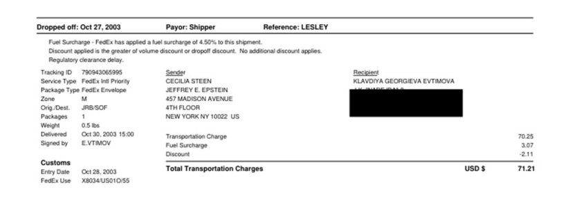 В различен документ с дата 28 октомври 2003 година още веднъж участва името Евтимова, по-конкретно Клавдия Георгиева Евтимова. Става дума за информация от американския снабдител “ФедЕкс ” - жена на име Сесилия Стийн е изпратила до Евтимова плик от името на Епстийн. Адресът на подателя е 457 Madison Ave - от други файлове излиза наяве, че там Епстийн има записана компания.