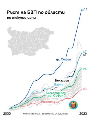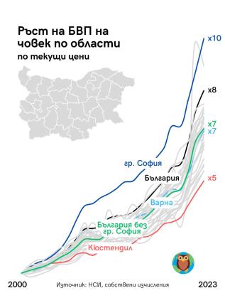 Това отразява и демографските промени, при които някои места се обезлюдяват, до момента в който София резервира жителите си. На глава от популацията Брутният вътрешен продукт в безспорна стойност след 2000 пораства въпреки всичко 10 пъти в София и едвам 7 пъти в останалата България. В най-слабата област по този индикатор - Кюстендил, цената на човек е пораснала единствено 5 пъти - двойно по-малко по отношение на тази в столицата. Така данните сочат, че взривът на българската стопанска система от последните години се е усетил доста по-силно в София, в сравнение с другаде. Разбира се, инфлацията на всички места смалява номиналния растеж в действително изражение.