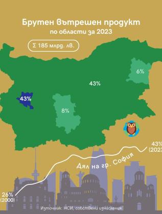 Доминацията на София не е съразмерна с каузи ѝ от популацията и е резултат от доста разнообразни фактори - дълготраен фокус на задграничните вложения там, непосредственост до държавните институции, по-добри благоприятни условия за обучение, които притеглят бъдещи експерти, и други Без да се вземе поради развиването на цените, стопанската система на София съгласно Национален статистически институт пораства цели 11 пъти за интервала след 2000, а тази на всички останали български области - общо едвам 5 пъти.