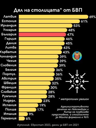 Същевременно концентрацията на икономическа интензивност в столицата не е нехарактерен феномен измежду европейските страни, както показва изображението по данни на Евростат с Брутният вътрешен продукт към 2021. Особено в страните със относително дребни повърхност и население - например прибалтийските републики, Ирландия или Дания, метрополните райони на столиците (т.е. с прилежащите предградия) дават отговор за над 40% от съответната стопанска система.