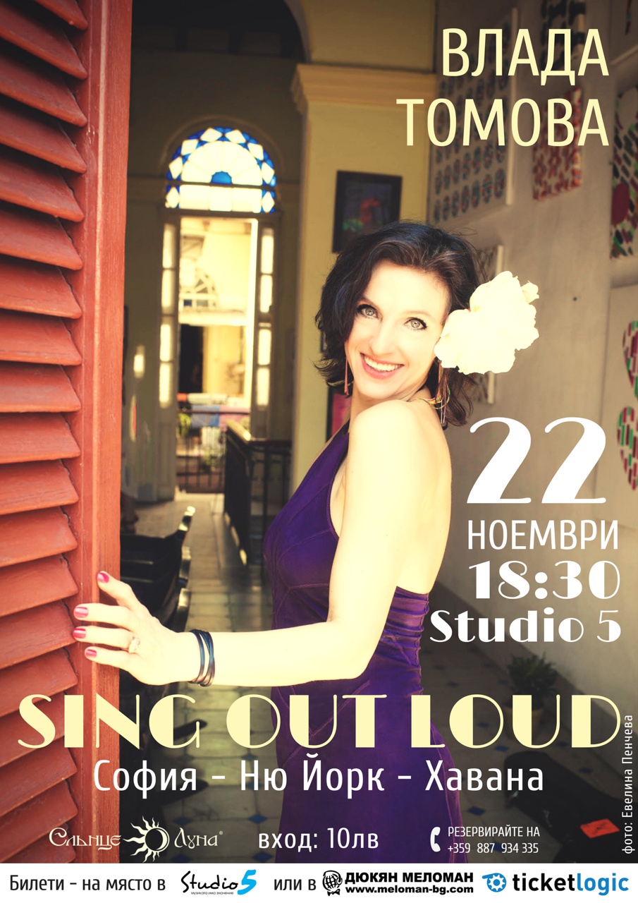 Българската певица, живееща в Ню Йорк - Влада Томова ще показа специфичен, бутиков концерт в София на 22 ноември. За почитателите и приятелите си в България тя е подготвила пъстра стратегия от обичаните си авторски части, музика от плановете “Балкански Приказки” и “Лазарската роза” и доста други. Интересна и нетрадиционна, водена от любовта си към България и любознанието си към света, Влада Томова ще показа и новото си видео към песента “SING OUT LOUD”. Видеото е снимано в Куба по-рано тази година и типично в неин музикален жанр съставлява комбинация от разнообразни култури, прелестна страст и сила, достоверни пъстри фрагменти от днешна Хавана и доста усмихнати лица.