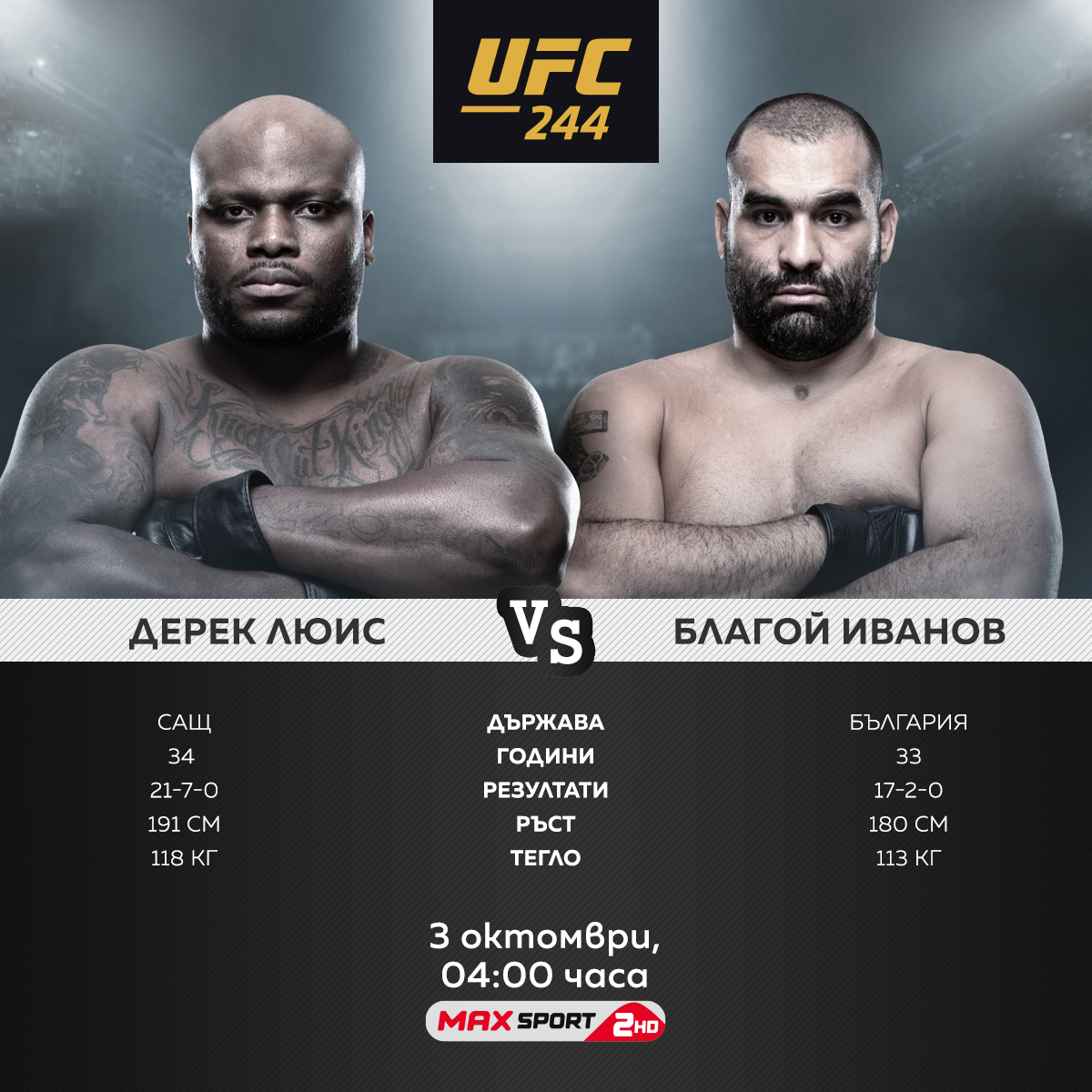 Българската звезда в свободните боеве Благой Иванов-Багата излиза в ранните часове на 3 ноември за четвъртия си мач от най-престижната ММА верига – UFC. Съперник на 33-годишния софиянец е страховитият американец Дерик Люис, като техният дуел ще е част от UFC 244. Събитието ще се организира в именитата зала Медисън Скуеър Гардън в Ню Йорк, а MAX Sport 2 ще го излъчва онлайн от 4:00 часа.
