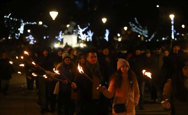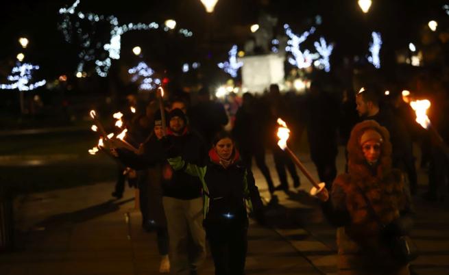 Шествието стартира тъкмо в 19.00 часа от паметника на Войнишкия лъв пред НДК. То е съпроводено от барабанен тон и водено от хора, облечени с национални носии.