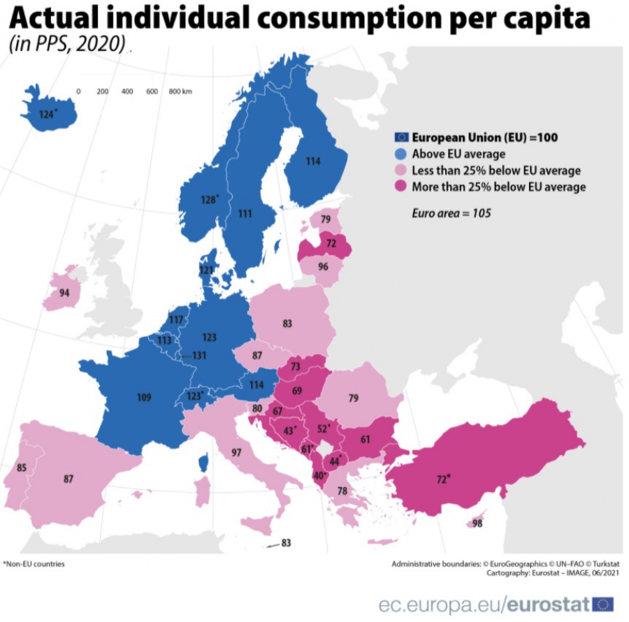 Трябва да се означи, че при все, че България е последна в Европейски Съюз, страната ни се намира в самобитния клуб на богатите. Казано с други думи – ниската икономическа база ни слага в неподходящо положения да догонваме едни от най-развитите страни в света. От друга страна, страните отвън Европейски Съюз са даже в още по-неблагоприятно положение. Така да вземем за пример, съгласно данните на Евростат, действителното самостоятелно ползване на човек от популацията в Сърбия е 48% под междинното за Европейски Съюз. В Република Северна Македония то доближава 56% под междинното за Европейски Съюз, до момента в който в Албания пада до цели 60% под междинното. В Черна Гора потреблението, тъкмо както в България, възлиза на 39% под междинното за Европейски Съюз, а в Босна и Херцеговина – 67% под междинното. Потреблението на глава от популацията в Турция доближава 28% под междинното за Европейски Съюз, което би я сложило в една група със Словакия, Латвия, Унгария и Хърватия, в случай че беше член на Европейски Съюз.