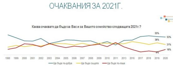Въпреки тестванията на 2020-та, а може би тъкмо заради тях, персоналният оптимизъм продължава да е водещ за преобладаващата част от българите – 53% чакат идната година да е по-добра. Песимистите за 2021 са 16%, а 31% не я свързват със съществени промени – било то за положително, или за неприятно.