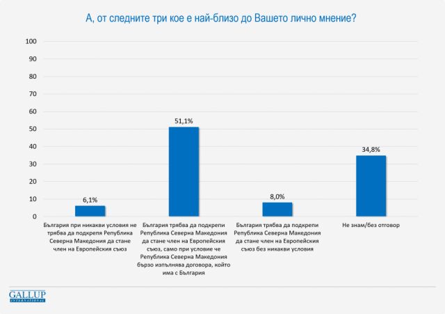 И въпреки всичко, безусловна поддръжка за участие в Европейски Съюз дават единствено 8%. Чувствително болшинство от 51,1% избира опцията „ България би трябвало да поддържа Република Северна Македония да стане член на Европейския съюз, единствено при изискване че Република Северна Македония бързо извършва контракта, който има с България “.