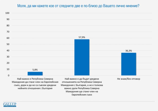 Респондентите бяха помолени да изберат кое от следните две е по-близо до тяхното персонално мнение: „ Най-важно е Република Северна Македония да стане член на Европейския съюз, даже и да не са напълно уредени нейните връзки с България “ или „ Най-важно е да бъдат уредени връзките на Република Северна Македония с България, а не е толкоз значимо дали Република Северна Македония ще стане член на Европейския съюз “. Първото избират 5,8%, второто 57,9%.