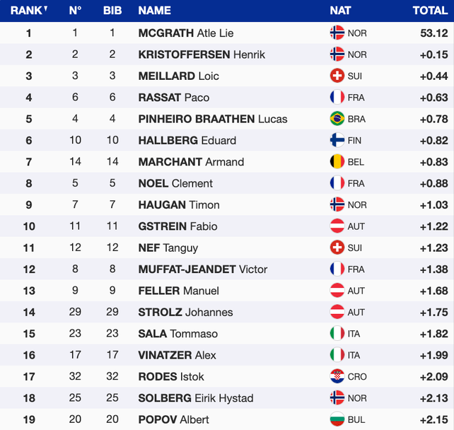 Топ 30 се затвори от американеца Бенджамин Ричи, който приключи на 2.84 от водача Макграт. А състезателят с най-заден стартов номер, който се класира за втория манш, е шведът Фабиан Акс Шварц, който започва с №52 и даде 21-во време, изоставайки с 2.36 от лидера. На старта през днешния ден застанаха общо 69 скиори, а до финала сполучливо стигнаха 51 от тях.
