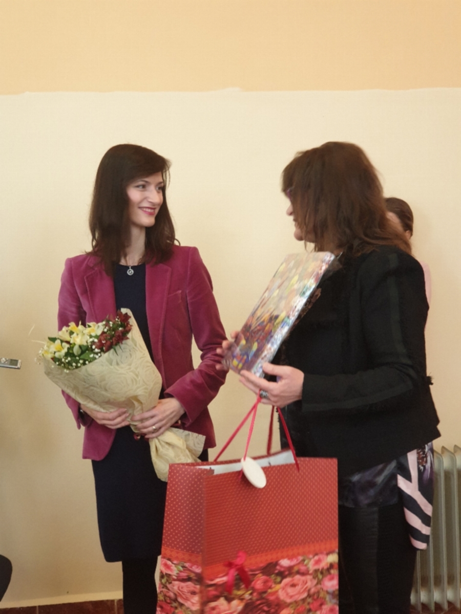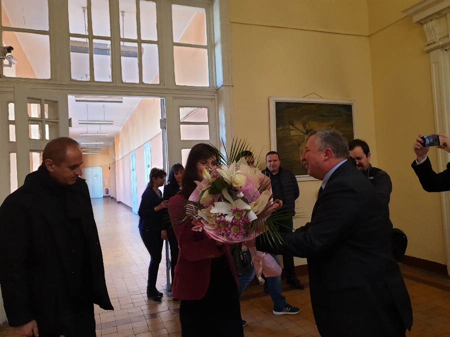 Тя бе посрещната от регионалния шеф на Кюстендил Виктор Янев, кмета на общината Петър Паунов и шефа на учебното заведение Иванка Янкова.