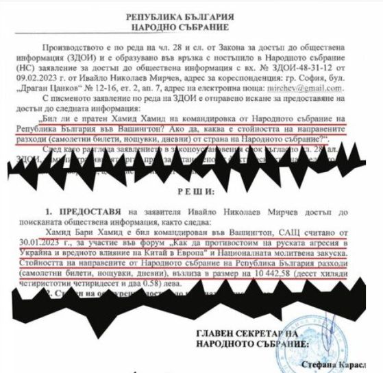 " Над 10 000 лева са били разноските, които Народното събрание е платил за пътуването на господин Хамид Хамид като компаньон на Иван Гешев в Съединени американски щати. Двамата бяха в Съединени американски щати, с цел да гледат на TV монитори молитвената закуска с хазаин президентът Байдън. Този отговор получих от администрацията на Народното събрание. Не излиза наяве каква е била цената на самата молитвена закуска и кой я е заплатил ", написа Ивайло Мирчев във фейсбук.