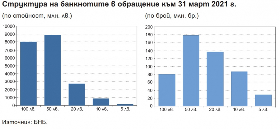 С максимален дял (34.92%) в общия брой на банкнотите в обращение в края на първото тримесечие на 2021 година е банкнотата с номинал 50 лв., като към 31 март в обращение са 178.1 млн. броя банкноти с този номинал. С минимален дял (5.54%) e броят на банкнотите от 5 лв..
