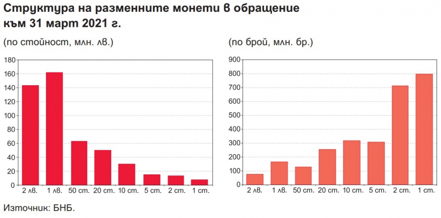 Тенденцията към увеличение на броя на разменните монети в обращение от всички номинали се резервира, само че темпът, с който те нарастват, се забавя. На годишна база с най-бърз ритъм нараства броят на монетите с номинал 2 лв. – с 10.3%. В края на март 2021 година в обращение са 71.7 млн. броя от тях, което съставлява нарастване с 6.7 млн. броя. Броят на монетите от 1, 2, 5, 10 и 20 стотинки в обращение нараства в границата от 3.6% до 5.4%. При монетите от 50 стотинки и от 1 лев повишаването на годишна база е надлежно 3.1% и 2.2%. Най-голям дял (29.0%) в общия брой на разменните монети в обращение в края на първото тримесечие на 2021 година имат монетите от 1 стотинка, като към 31 март отвън касите на Българска народна банка са 794.9 млн. броя с този номинал. С минимален дял (2.62%) е броят на монетите от 2 лв..