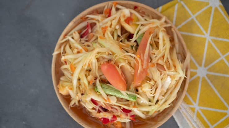 Снимка: Сом там е сладка тайландска салата, приготвена от неузряла папая, дълъг фасул, лайм, чесън, фъстъци и захар | Източник: Getty ImagesЗа незабравима елегантна вечеря има Saawaan, където Суджира „ Аом “ Понгморн сервира салати от говеждо месо, дипове с лой от раци, свински врат на скара и пикантно-кисели супи в деликатни порции.За отмора от тайландската храна пасажерите могат да се насочат към „ Йен акат роуд “ – една от най-разпространените пътни артерии в региона – за тартар от говеждо месо и ризото с трюфели в Cagette Canteen & Deli. За една друга страна на Европа има Suhring с две звезди „ Мишлен “ – немски изтънчен ресторант, ръководен от братя близнаци, който беше определен за номер 6 в „ 50-те най-хубави ресторанта в Азия “ през 2021 г.Сиам и СукхумвитХиперкомерсиалното сърце на Банкок е освен това от парадайс за феновете на покупките. Закуската тук може да бъде здравословна купа асай или бурито за закуска от Luka Siri House, флорално леговище с красиви зелени площи покрай станцията Chidlom Skytrain.За по-официална тайландска вечеря има Paste –ресторантът се класирана на 38-о място в листата на „ 50-те най-хубави заведения за хранене в Азия “ през 2020 година, предлагащ обичайната кухня с креативен акценти.Пътуващите могат да следват тълпите от офисите до Sanguan Sri на „ Уитхаю роуд “, с цел да опитат ароматни къри, като ганг кю уан нуеа (говеждо зелено къри) в тази комфортна за емигранти част на Банкок.Духът на кулинарния интернационализъм е жив и здрав в места като Appia, тратория в римски жанр, както и в El Mercado, където ръчно основано меню включва съществени ястия като новозеландски миди и австралийско филе.