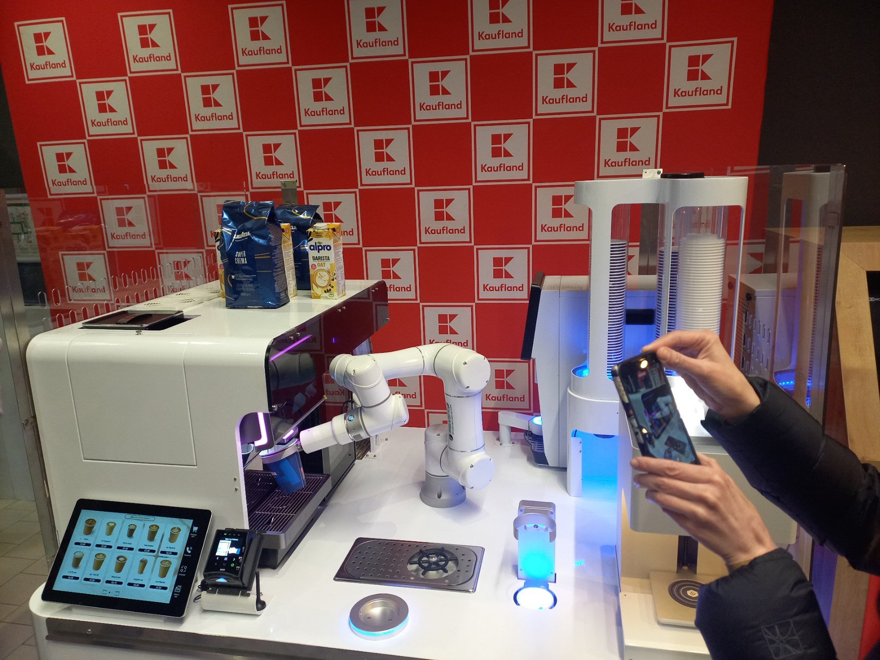 Бариста-робот прави 15 типа кафе в един от магазините на Кaufland. Сред 15-те типа питиета са познатите ни еспресо, американо, лате и една напитка единствено с мляко.