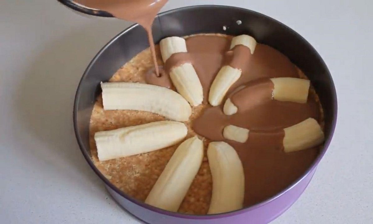 Обелете бананите, нарежете ги по дължина на половинки. След това сложете бананите върху тортата и ги залейте с шоколадовия крем. Ако бананите са леко изпъкнали, можете деликатно да ги натъпчете с лъжица или шпатула. След това сложете тортата в хладилника да стегне. След 2-3 часа деликатно извадете формата и декорирайте с настърган шоколад.