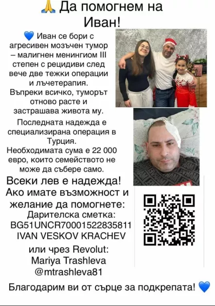 Баща на две дребни деца се нуждае от помощта ни, с цел да оздравее. Иван Весков Крачев е на 37 години, родом от село Цалапица, само че от години живее със своето прелестно семейство в Пловдив. От януари тази година животът му се прекатурва поради тежка диагноза – нападателен мозъчен израстък, малигнен менингиом с рецидиви. Въпреки две тежки интервенции и лъчетерапии, туморът продължава да пораства и заплашва живота му.