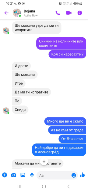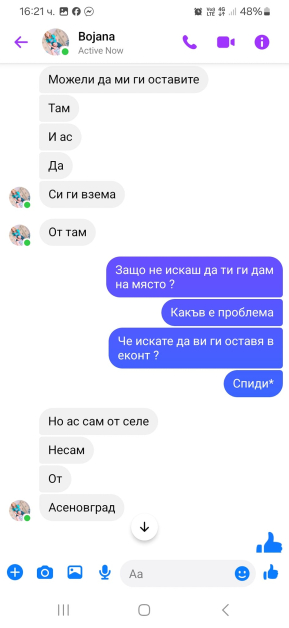 " Не знам за какво упорства за спиди, като й предложих да й ги закарам на място! И тя отново си знае нейното. Нещо тук ме съмнява! Няма пари за количка,а в това време желае със спиди в Асеновград да и ги изпратя. Пазете се от нея, ще кача още фотоси с чата! Не пращайте нищо, очевидно ги взима за препродаване! ", написа Венцислав Странджалиев.
