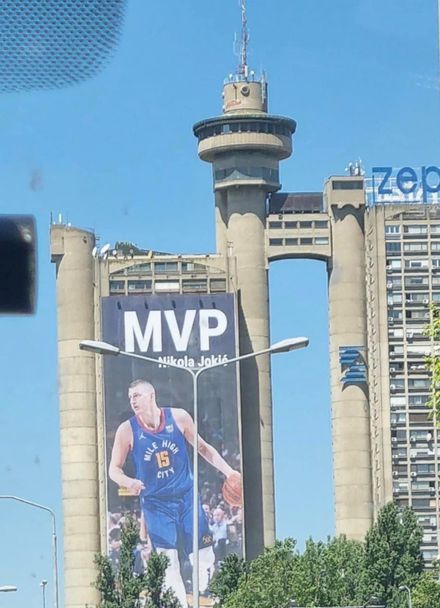 Той показа фотография, на която се вижда голям афиш на сръбската мегазвезда Никола Йокич и надпис MVP върху жилищна постройка в Сърбия и написа: