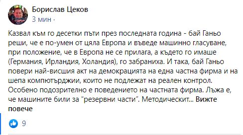 " Бай Ганьо реши, че е по-умен от цяла Европа и вкара машинно гласоподаване, в случай, че в Европа не се ползва, а където го имаше (Германия, Ирландия, Холандия), го не разрешиха. И по този начин, бай Ганьо повери най-висшия акт на демокрацията на една частна компания и на шепа компютърджии, които не подлежат на действителен надзор. " написа в профила си във " Facebook " юлистът Борислав Цеков. " Лъжа е, че машините били за “резервни части”. Методическите инструкции на ЦИК не разрешават поправки и промяна на части ", разяснява той. Според него, " ЦИК стана съизвършител в евентуалното компрометиране на изоорите ".